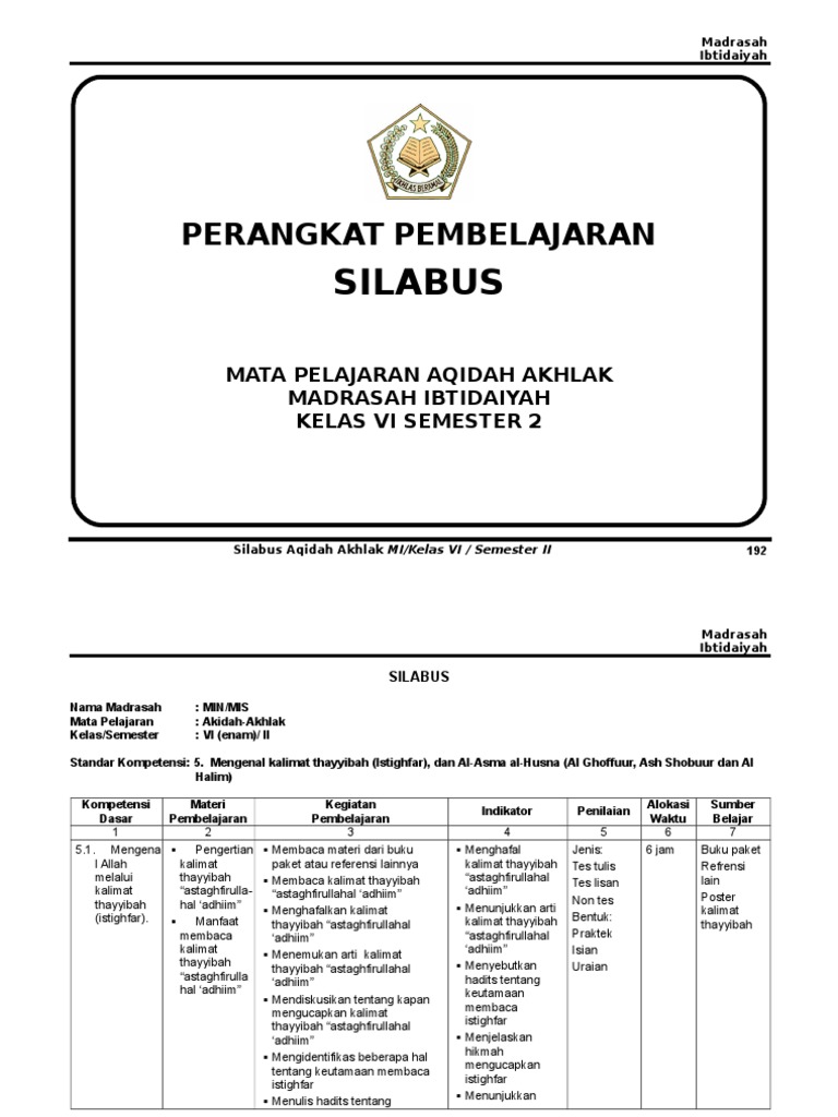 Silabus aqidah akhlak mi kurikulum 2013. Rpp aqidah akhlak mi (madrasah ibtidaiyah). Download silabus akidah akhlak smp/mts kelas 9 semester 1 dan 2 kurikulum 2013. Buku akidah akhlak mi kelas 1 kemenag buku lain yang menunjang multimedia interaktif dan internet. Silabus digunakan untuk menyebut suatu produk pengembangan kurikulum berupa penjabaran lebih.